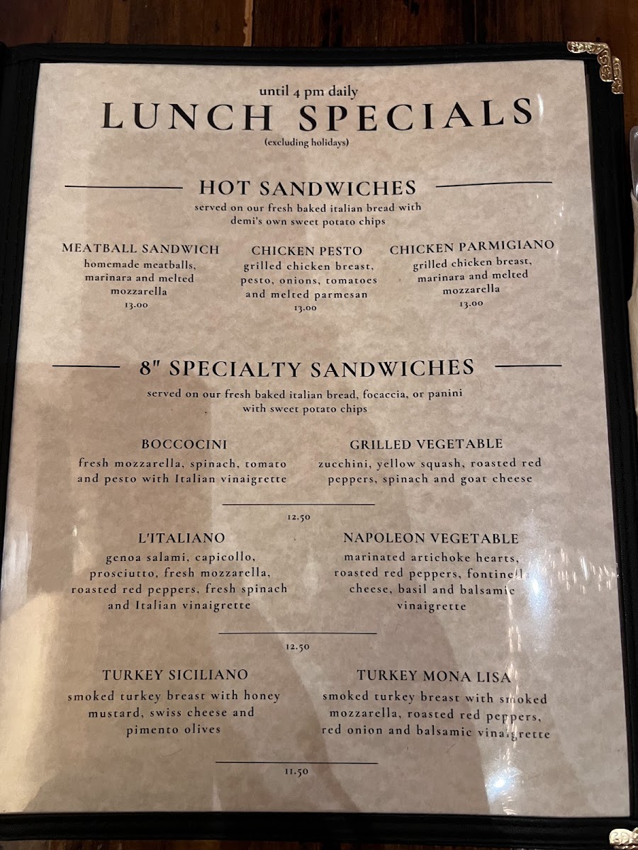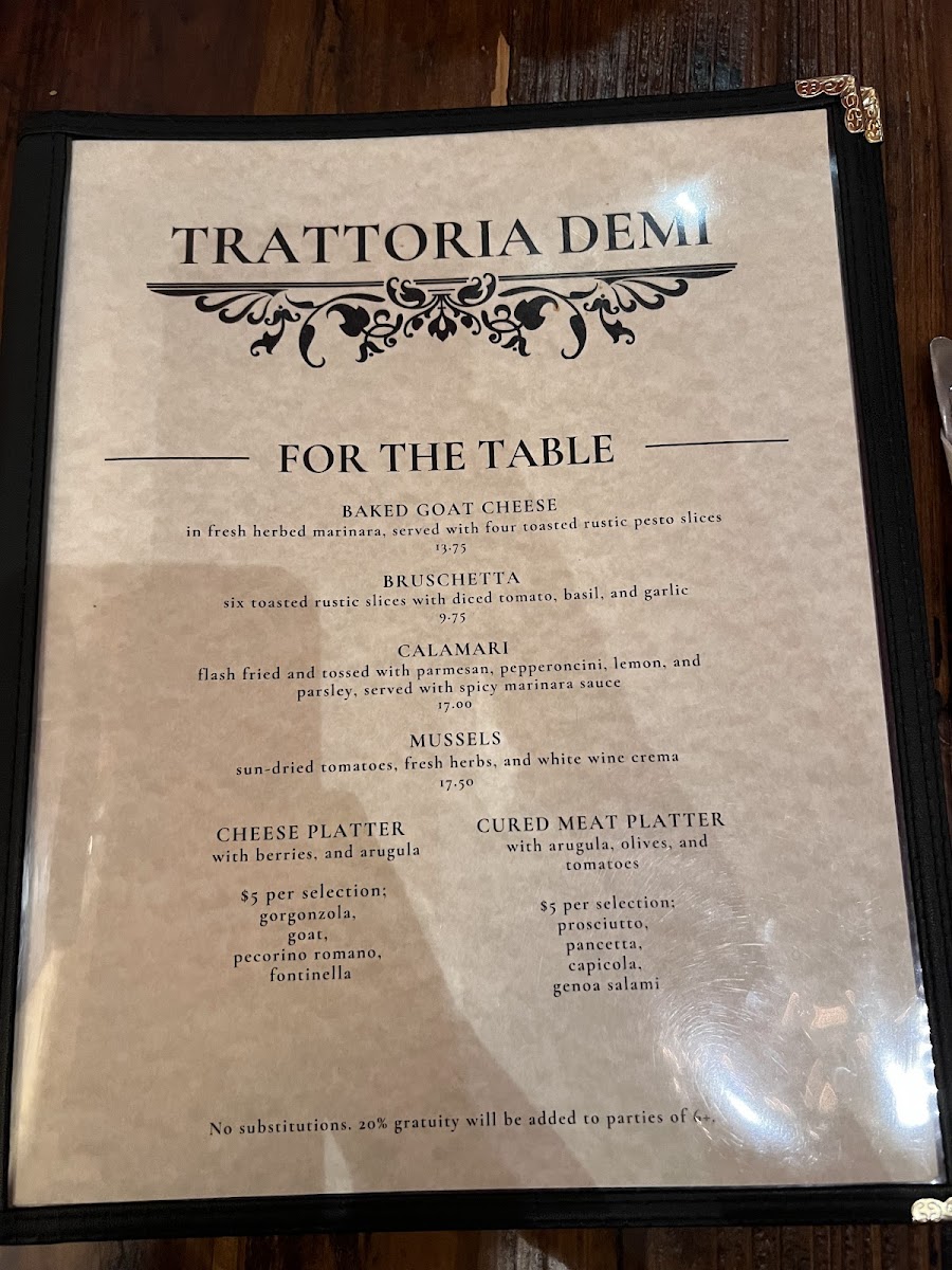 Whether you're enjoying a casual meal or celebrating a special occasion, Trattoria Demi's menu offers a perfect blend of Italian tradition and contemporary flair. Pair your meal with a selection from their diverse range of wines and drinks for a complete dining experience.