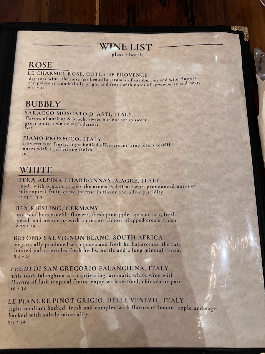 Seafood enthusiasts can indulge in the Shrimp Risotto ($24), Pan Roasted Bronzini ($26), or Cioppino ($28), all of which showcase the freshness of the sea.