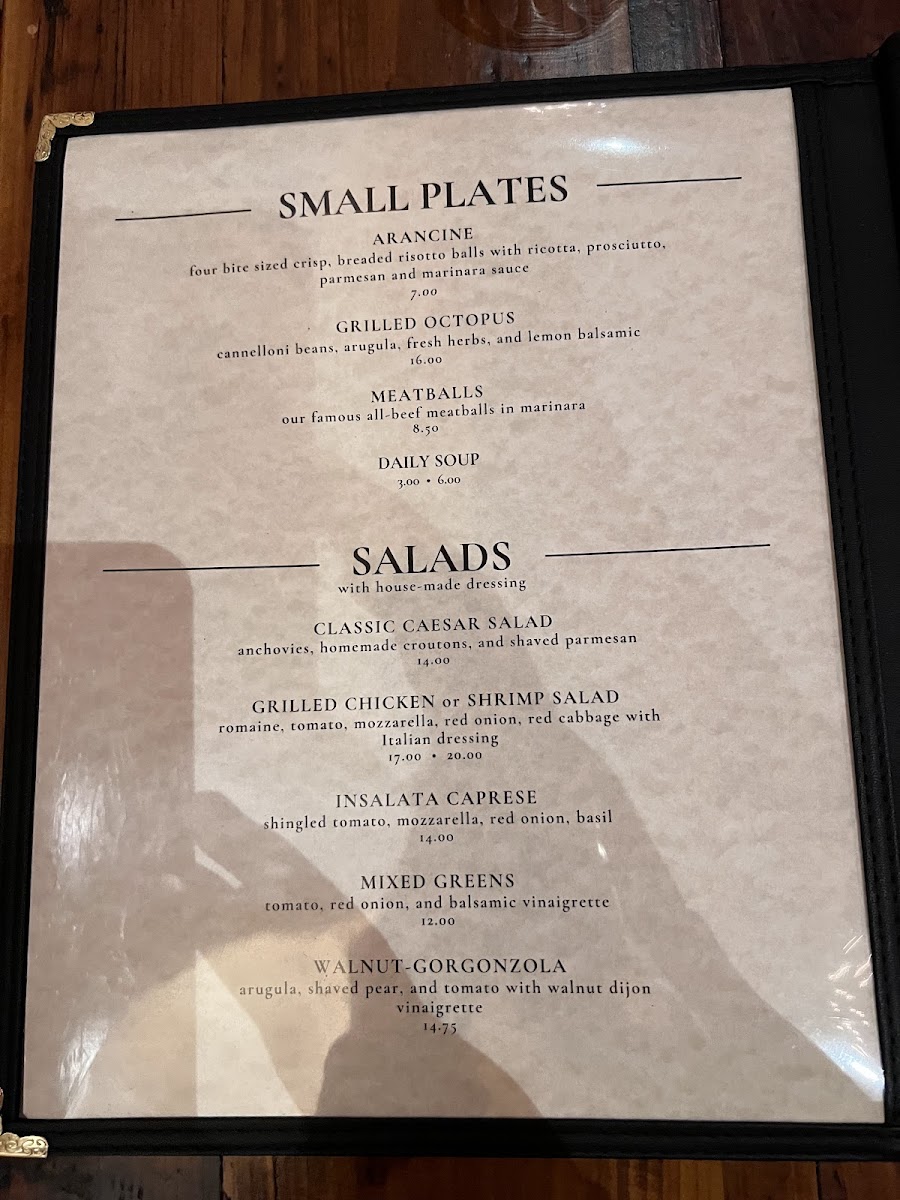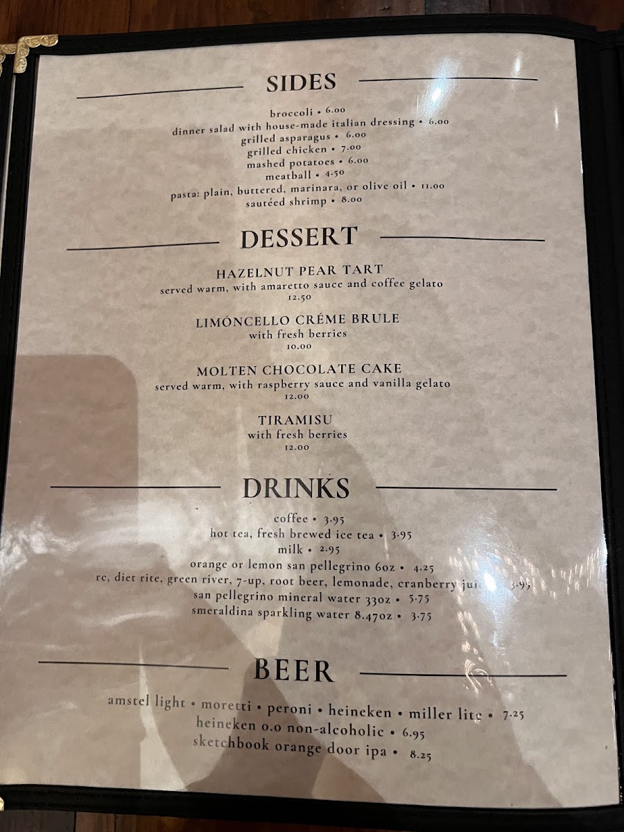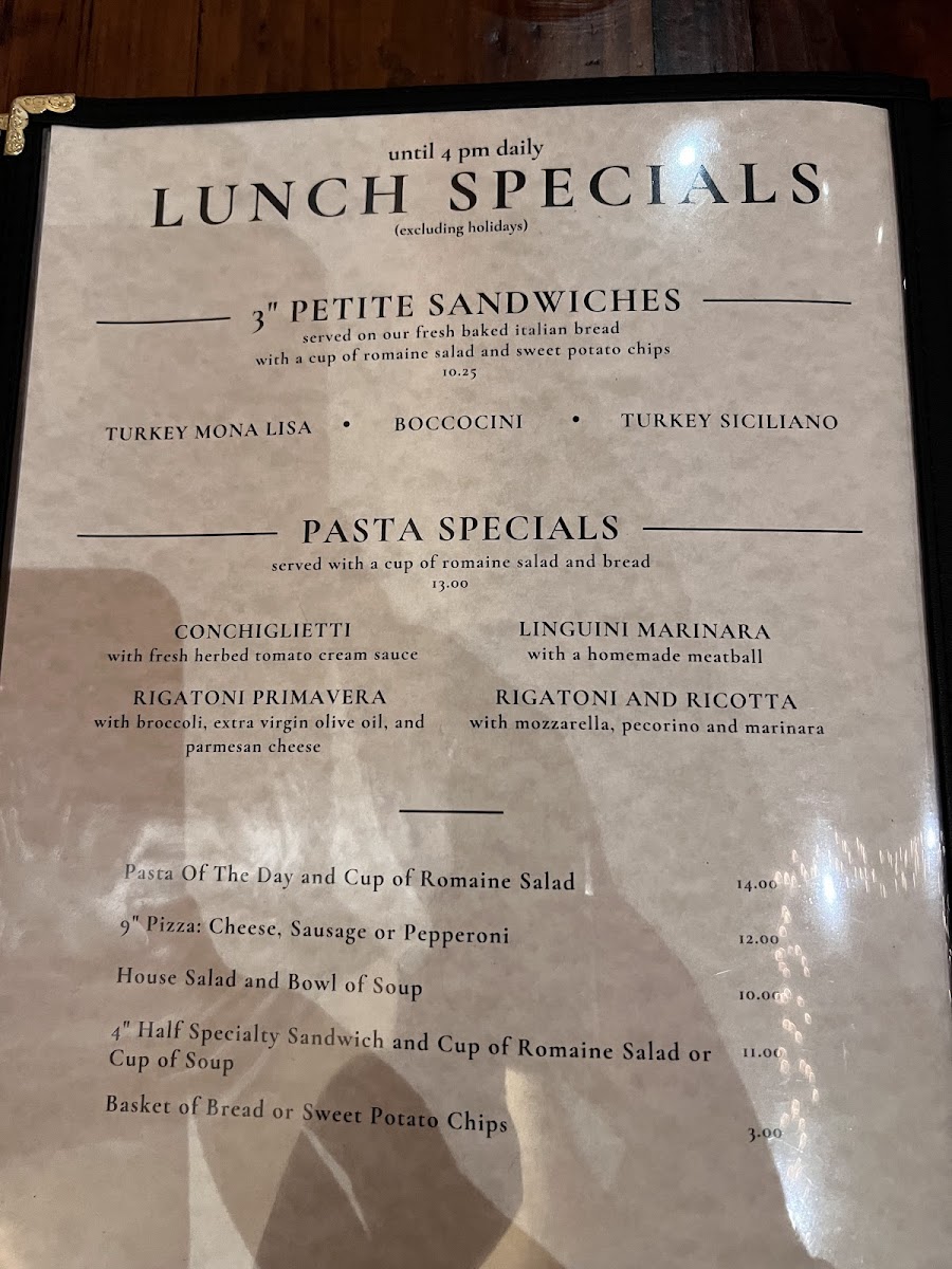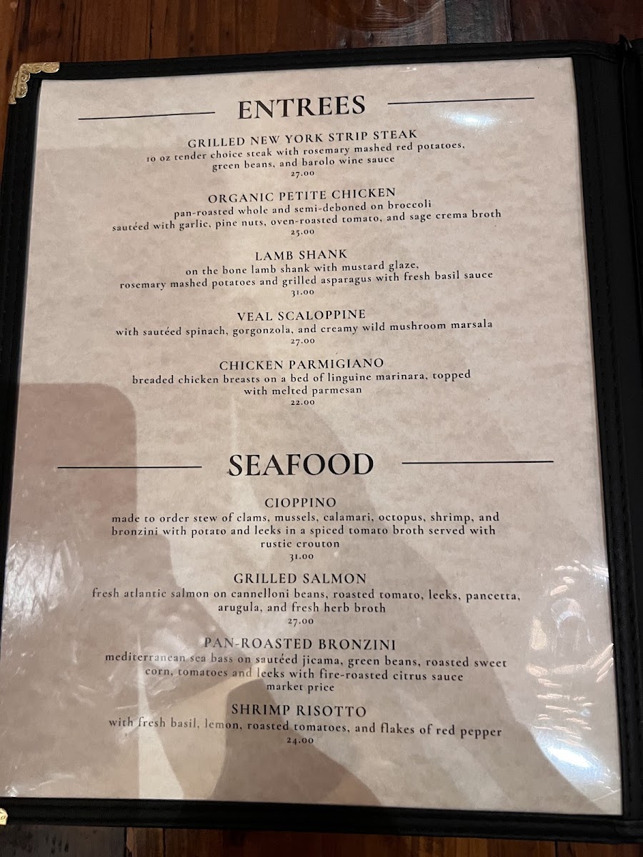 For entrée lovers, the menu features a selection of beautifully cooked meats. The Grilled New York Strip Steak ($28) and Organic Petite Chicken ($24) are perfect for carnivores, while the Lamb Shank ($26) and Veal Scaloppine ($22) offer rich, flavorful choices. Chicken Parmigiano "Demi Style" ($20) is a perfect Italian comfort dish, prepared to perfection.