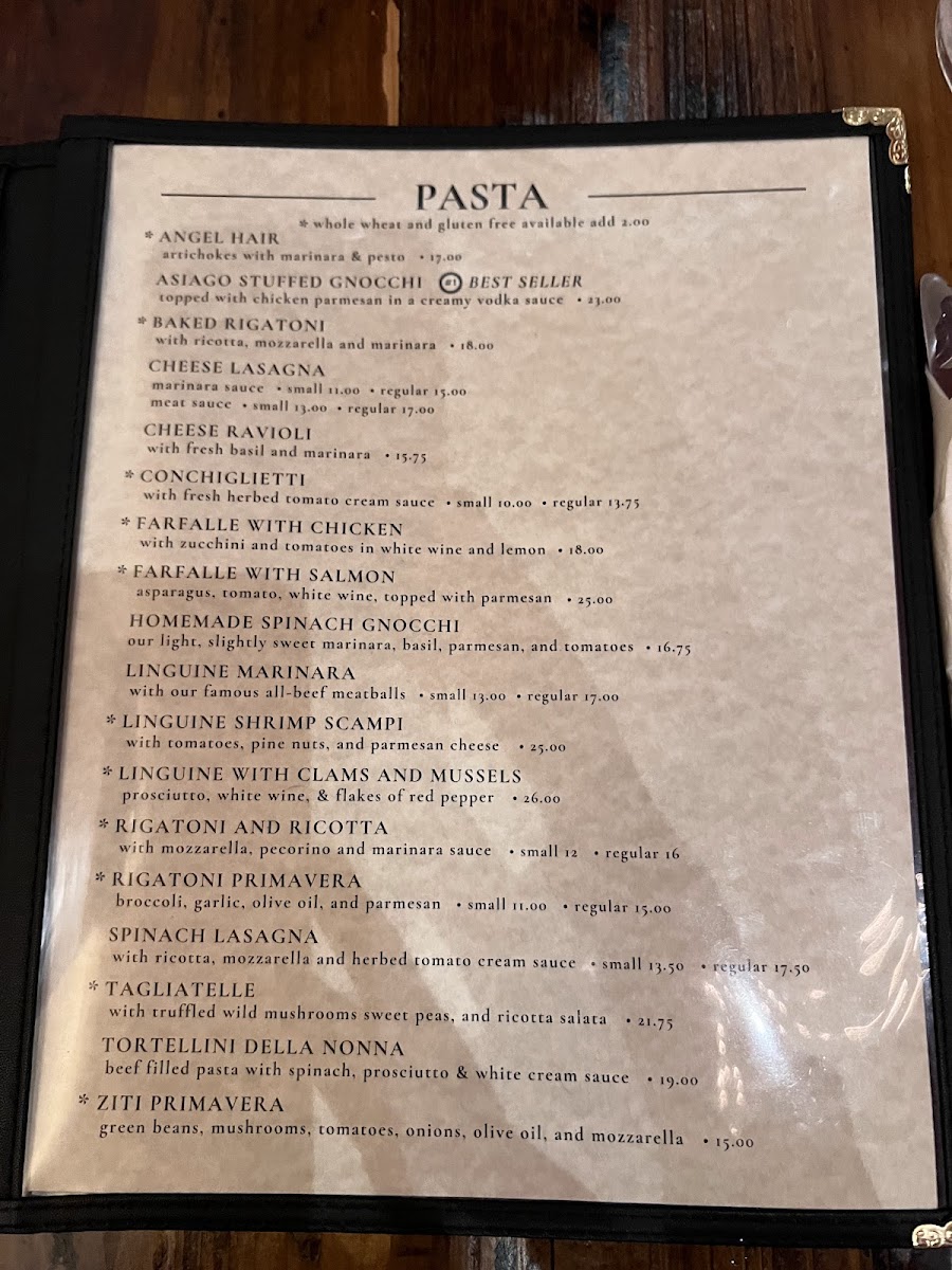 Moving on to the heartier dishes, the pasta offerings include classics like Ziti Primavera ($16), Asiago Stuffed Gnocchi ($18), and the indulgent Farfalle with Salmon ($22). For those looking for a truly authentic experience, the Homemade Spinach Gnocchi ($18) and Angel Hair with Artichokes ($17) are crowd favorites.